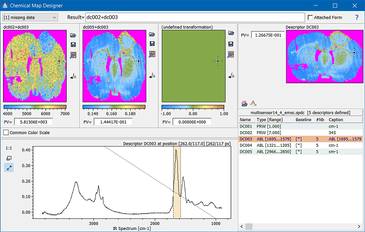 Chemical images (or chemical maps, as they are also called) are calculated using arbitrary mathematical formulas which combine the data provided by spectral descriptors into image information. The creation of chemical images is a two step process: first you have to specify the desired relationship using the chemical image editor and store it as an Epina ImageLab script; in a second step the developed chemical image script is applied to the currently loaded data simply by loading and executing this script (see also Special Images). The chemical image editor offers a simple user interface where you can experiment with various mathematical transformations and combinations of the spectral descriptors. It offers three independent test channels which can be used to compare the results of various mathematical transformations. In order to calculate a chemical map, simply enter the intended equation into the top field and click any of the "fx" buttons in the preview part below. When a particular chemical image fits your needs you can save the corresponding equation and apply it in the 2D Imager window.