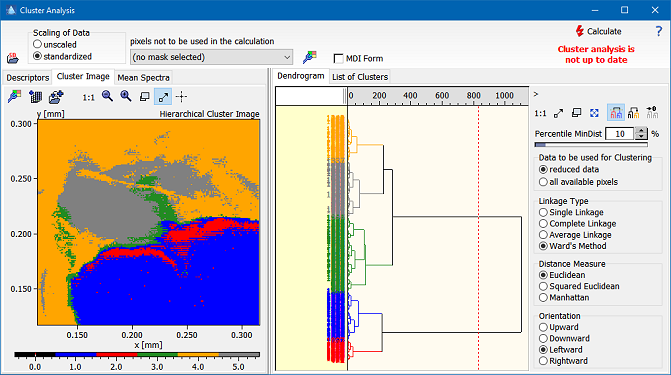 The hierarchical cluster analysis provides an efficient means to find out any clusters in the spectral space. After calculating the cluster analysis the user can assign different class numbers to individual parts of the resulting dendrogram. The classes are indicated by different colors which can be adjusted by the user using the command Setup/Class Colors. Please note that for larger images the calculation of the dendrogram is rather time consuming and requires a high amount of memory. The memory requirements for a square image of n pixels are approximately 8n4 bytes, which, for example, comes to about 800 MB for a 100x100 image. Epina ImageLab issues a warning message if the number of pixels exceeds a limit causing excessively high computation times. In order to speed up calculations for preliminary analyses the user may select a reduced dataset using pre-calculated cluster centers. The reduction of the dataset works according to the following idea: in the first step the distances of all spectra (pixels) are calculated and those which are closer to each other than a predefined part are combined into mini clusters which are represented by their average spectra. This way the the number of spectra submitted to the final cluster analysis is reduced to a manageable number (less than 10000). The sensitivity of the creation of the mini clusters can be controlled by the parameter "Percentile MinDist" which defines the percentile of all distances which are not regarded significant. A higher value of "Percentile MinDist" creates less mini clusters.