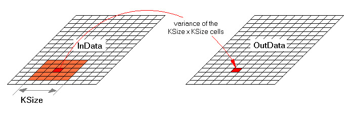SpatialVariance calculates for each cell of the array InData the local variance of matrix cells in a quadratic region with an edge length of KSize. The results are written to OutData which is automatically resized to match the size of InData.