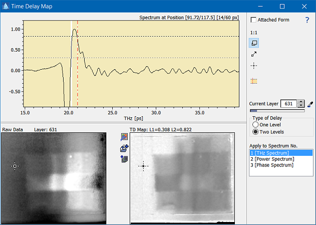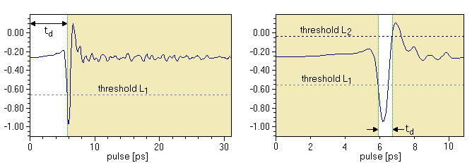 The time delay (TD) map is typically used to visualize the thickness of some material, or other physical properties which cause a time shift of pulsed excitation signals. Each pixel of a TD map contains the time shift exhibited at the particular position of the material. The time shift is calculated by measuring the difference in the between a reference point and the intersection of the signal with a user-defined threshold L1. The reference point can be either zero (see figure below, left) or derived from a second threshold L2 (right).